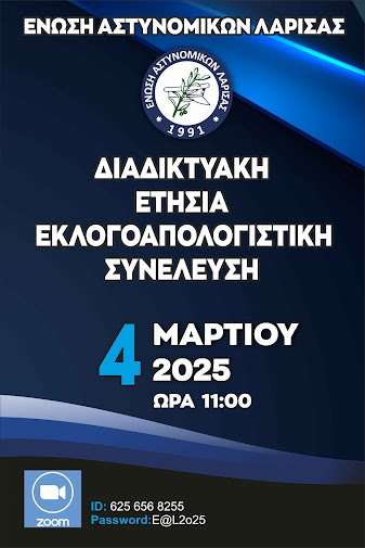 Η Ένωση Αστυνομικών Λάρισας ανακοίνωσε τη διεξαγωγή της Εκλογοαπολογιστικής Γενικής Συνέλευσης την Τρίτη 4 Μαρτίου 2025, στις 11:00 π.μ. Η συνέλευση θα πραγματοποιηθεί διαδικτυακά μέσω της πλατφόρμας Zoom και αφορά τα οικονομικά τακτοποιημένα τακτικά μέλη της Ένωσης.