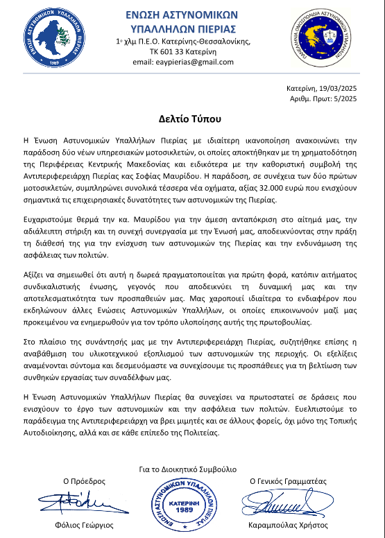 Η Ένωση Αστυνομικών Υπαλλήλων Πιερίας δεσμεύεται να συνεχίσει τις πρωτοβουλίες για τη βελτίωση των συνθηκών εργασίας των συναδέλφων της, καλώντας και άλλους φορείς να ακολουθήσουν το παράδειγμα της Περιφέρειας για την ενίσχυση της ασφάλειας των πολιτών.
