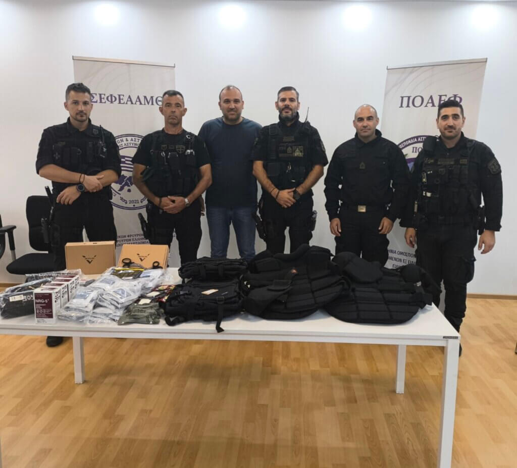 Στον Αστυνόμο Β’ κ. ΤΖΟΧΑΝΔΕΡΟΠΟΥΛΟ Γεώργιο παραδώσαμε για την Διμοιρία Υποστήριξης Δράμας θώρακα προστασίας, γιλέκα μάχης, γάντια προστασίας χειριστή φυσούνας και μεταφοράς υλικών και θήκες για ατομικούς πυροσβεστήρες.